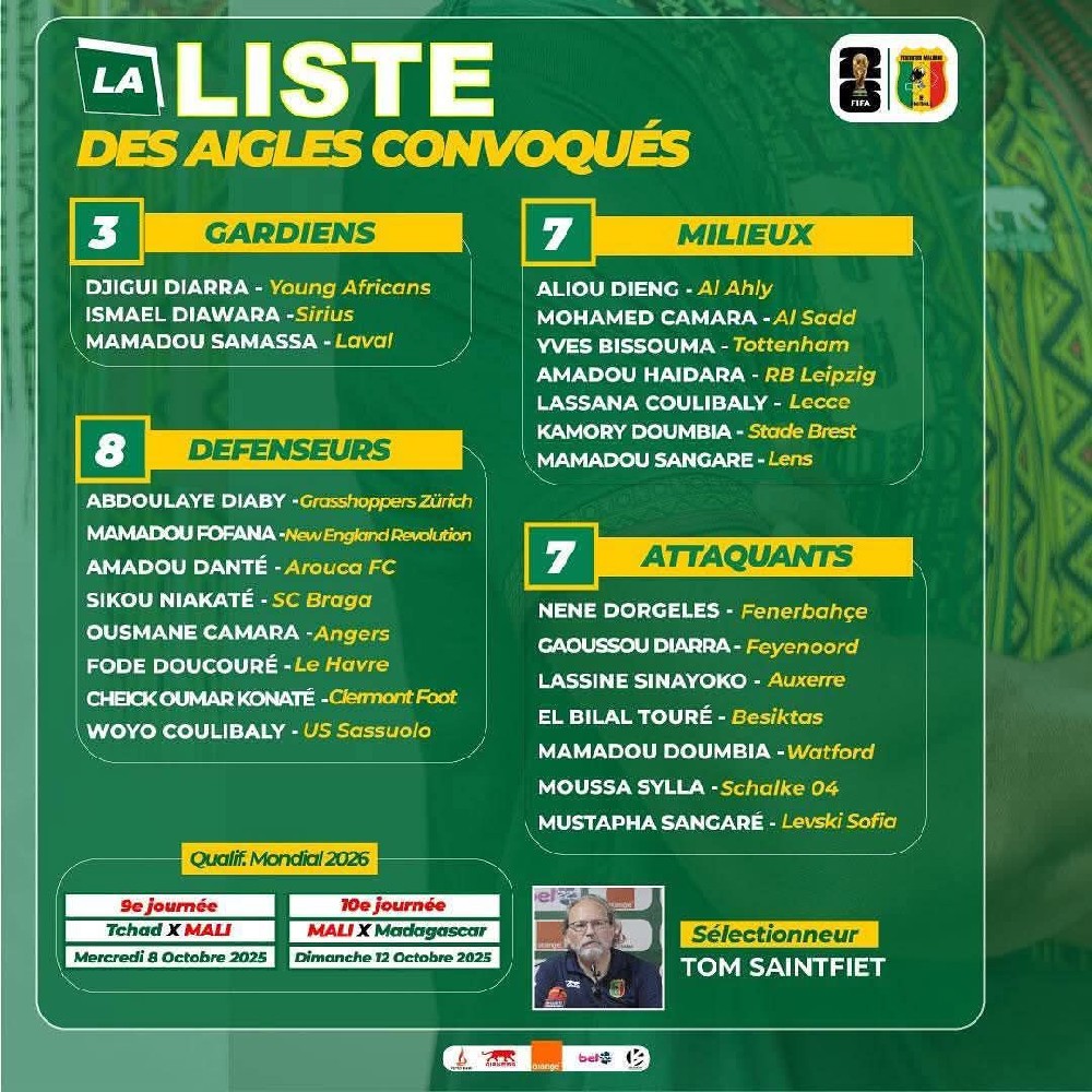 أعلن المدرب إريك شيل، المدير الفني لـ منتخب مالي، القائمة المستدعاه لخوض مباراتي تشاد ومدغشقر،ضمن التصفيات الأفريقية المؤهلة لكأس العالم 2026.