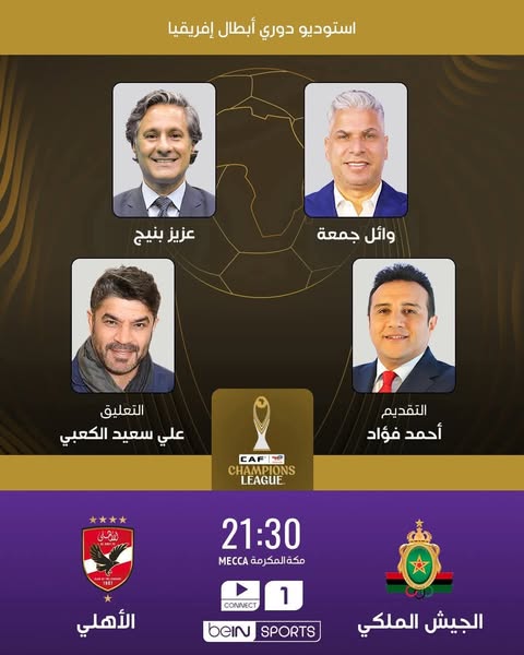 وتذاع مباراة الأهلي والجيش الملكي المغربي، عبر قناة بي إن سبورت hd 1، لكونها الناقل الحصري لمباريات دوري أبطال إفريقيا.