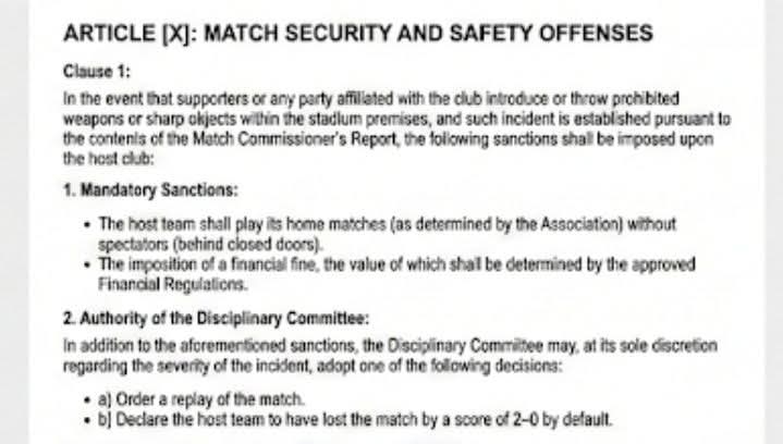 كما يتضمن نطاق العقوبات الممكنة إعادة المباراة أو حتى اعتبار الفريق خاسرًا بنتيجة (2–0) إذا رأت لجنة الانضباط أن الواقعة أثرت على سير اللقاء أو عرّضت عناصر المباراة للخطر بشكل مباشر.