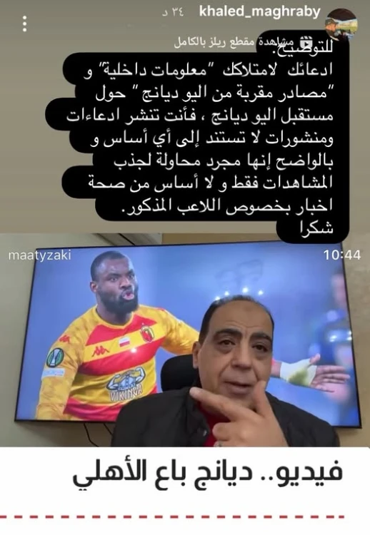 وقال مغربي عبر حسابه الرسمي على موقع "إنستجرام":"ادعاؤك امتلاك معلومات داخلية ومصادر مقربة من أليو ديانج حول مستقبله، ما هو إلا نشر لادعاءات ومنشورات لا تستند إلى أي أساس من الصحة".