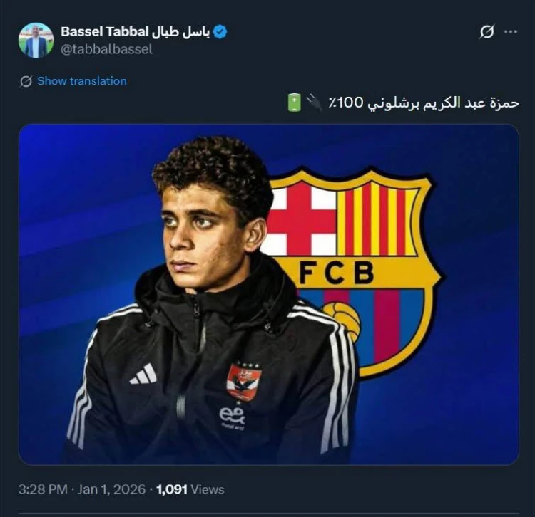 وفي هذا الصدد، كتب باسل طبال مراسل قناة بي إن سبورت عبر حسابه الرسمي على منصة "إكس" أن حمزة عبد الكريم برشلوني 100%.