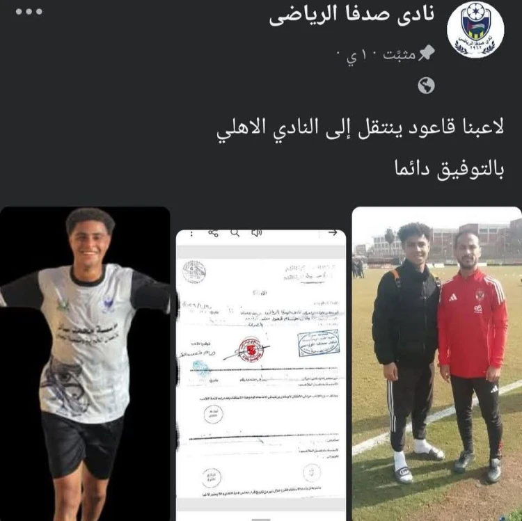 وفي هذا الصدد، أعلن نادي صدفا الأسيوطي أحد أندية الدرجة الثالثة في الدوري المصري، انتقال لاعبه حسام قاعود إلى صفوف الأهلي، خلال الانتقالات الشتوية الجارية.