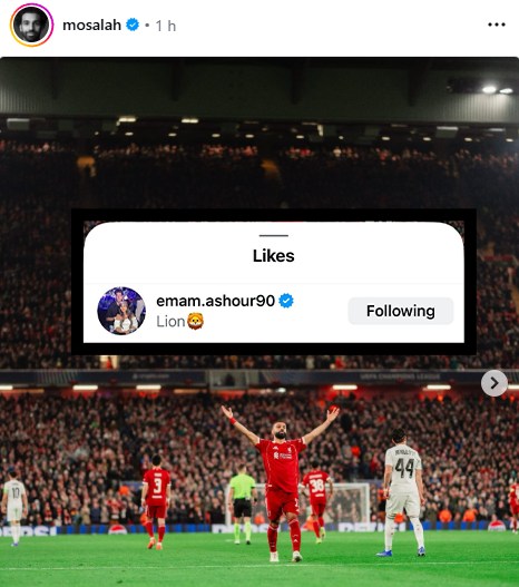 تفاعل إمام عاشور، لاعب الأهلي، مع صورة نشرها محمد صلاح، قائد منتخب مصر ولاعب ليفربول الإنجليزي، عبر حساب الأخير على مواقع التواصل الاجتماعي.