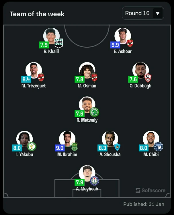 التشكيل المثالي للجولة الـ16 من الدوري المصري وفقا لـ سوفا سكور
