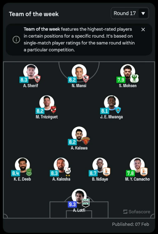شهد التشكيل المثالي للجولة السابعة عشر من الدوري المصري، وفقا للشبكة العالمية "سوفا سكور" عن وجود لاعب من الأهلي.