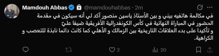 ففي خطوة لافتة قد تمهد لمرحلة جديدة في العلاقات بين قطبي الكرة المصرية، كشف رئيس نادي الزمالك الأسبق ورجل الأعمال المعروف، ممدوح عباس عن تواصل هاتفي جمعه مع نائب رئيس النادي الأهلي ياسين منصور، مؤكدًا اتفاقهما على حضور الأخير نهائي كأس الكونفدرالية الإفريقية كضيف عليه، بعد تأهل نادي الزمالك للمباراة النهائية.
